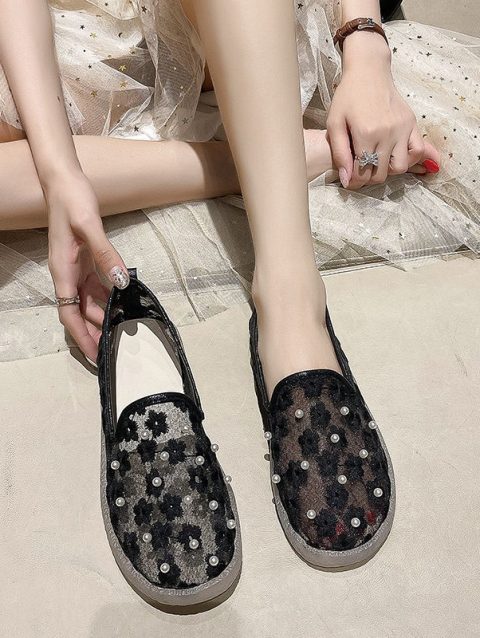 Flower Embroidered Lace Mesh Loafers Women Pearl Moccasins Ladies Summer Walking Shoes Fashion Clear Sole Slip-on Ballet Flats