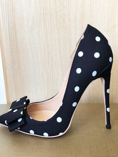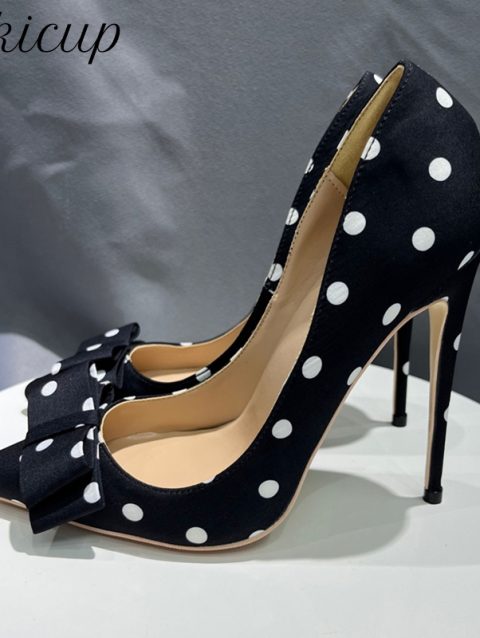 Tikicup Polka Dot Women Black Satin Stiletto High Heels with Bowknot Chic Ladies Designer Dress Shoes Pointed Toe Silk Pumps