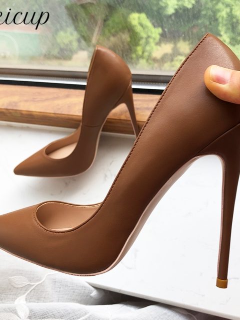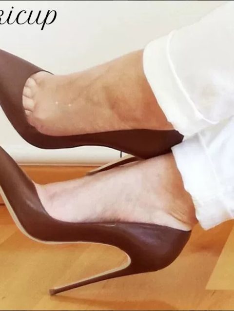 Tikicup Dark Brown Matte Women Pointy Toe Slip On High Heel Shoes Elegant Ladies Formal Dress Stiletto Pumps Plus Size 33-45