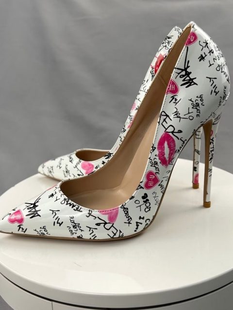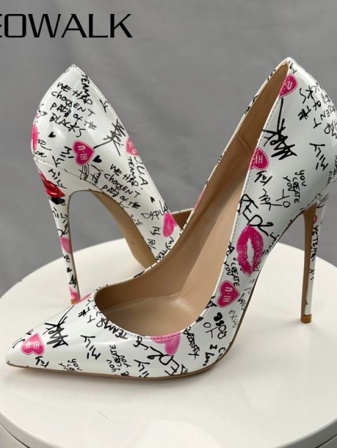 Veowalk White Artistic Graffiti Print Women Sexy Pointed Toe High Heel Shoes Slip on Stiletto Party Dress Shoes Plus Size 33-46
