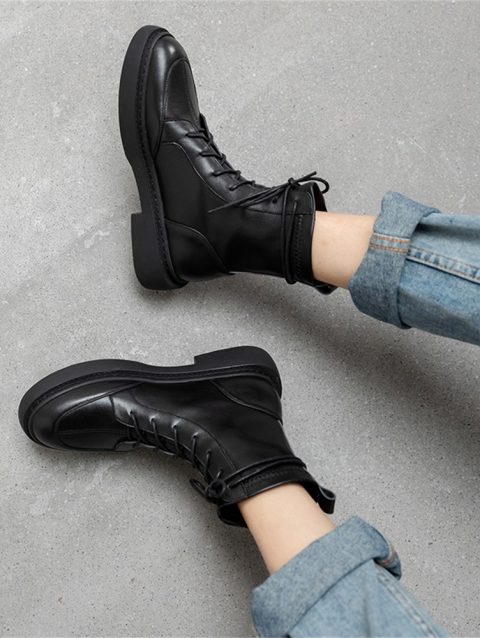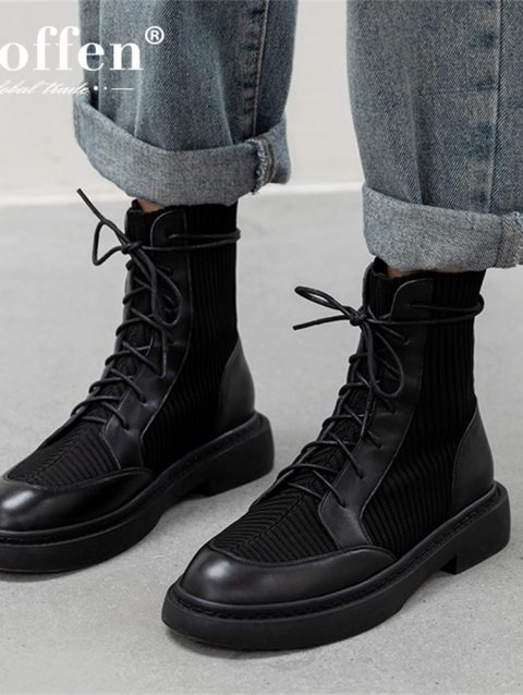 Taoffen 2024 Fashion Genuine Leather Women Boots Soft Leather Thick Bottom Lace Up Splicing Boots Flat Black Motorcycle Shoes
