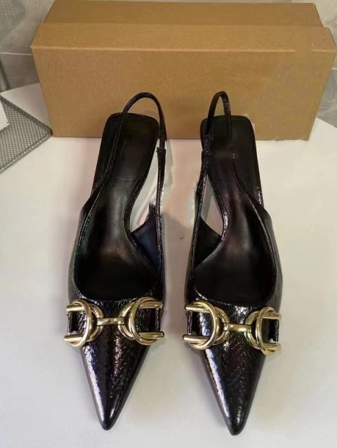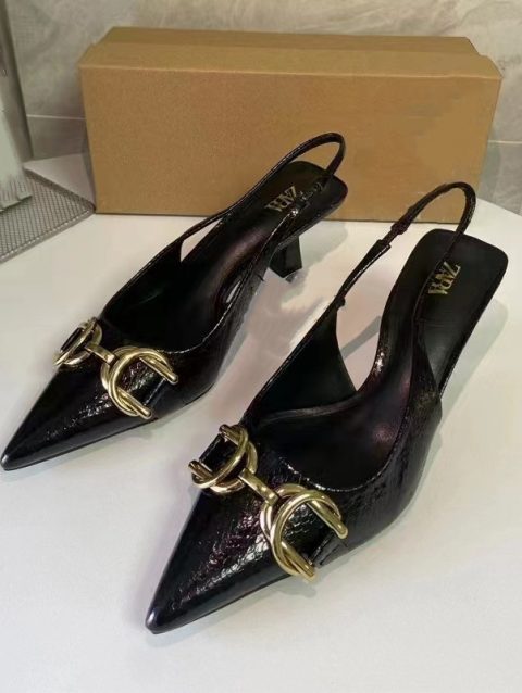 TRAF Women Summer Black Pumps 2024 Golden Decorative Details Pointed High Heels Shallow Thin Heel Woman Shoes Slingback Sandals