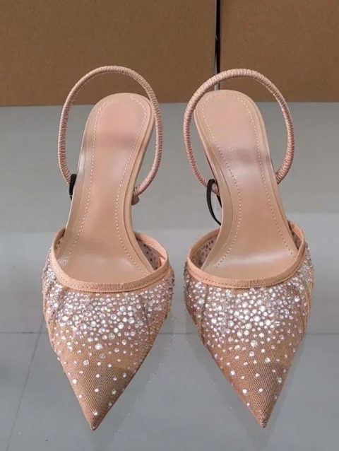 2025 Summer New Women’s Sandals Water Diamond Bright Mesh High Heels Footwear Elegant Slingback Pointed Slip on Party Lady Shoes