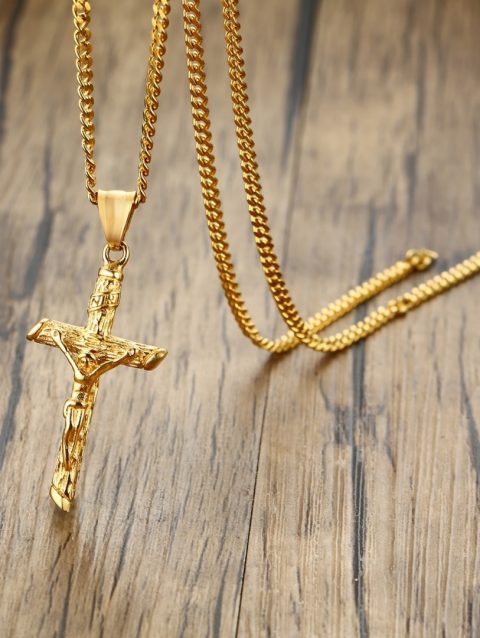 Stainless Steel Cross Necklace Catholicism Jesus Pendant Gold Color Collar Church Prayer Faith Jewelry for Men Women Gift