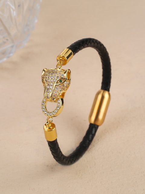 Bully Animal Style Leopard Head Braided Leather Rope Bracelet Fashion for Man Woman Stainless Steel Zirconia Jewelry Daily Wear
