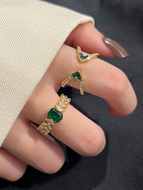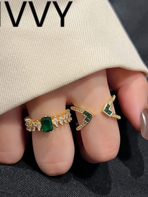 LIVVY Korean Light Luxury Green Zircon Ring Woman Fashion Retro Personality Adjustable Geometry Gold Color Rings