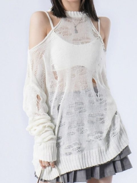 2024 Autumn Versatile Top Show Shoulder Knitted Subculture Y2K Sweet Spice Girl Thin Hollow Out Chic Sweater Pullover