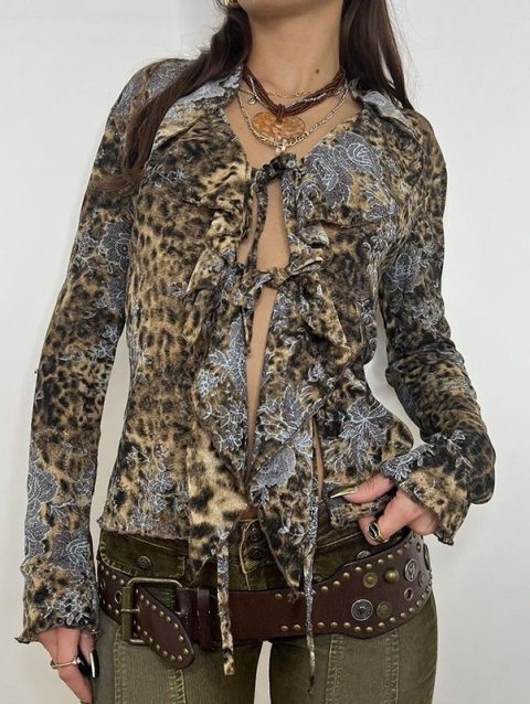 Women’s Retro Contrasting Strap Printed Cardigan T-shirt Female Long Sleeved Slim Ruffle Collar Sexy Tops