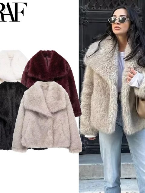 TRAF 2024 Woman Autumn Winter Faux Fur Coat Plush Fluffy Women’s Jacket New in Outerwears White Red Gray Black Wool Blends Coats