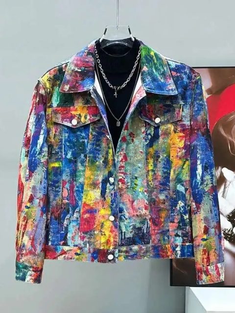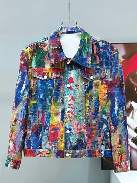 Unisex Harajuku Spring Rainbow Color Graffiti Hand Painted Denim Jacket Contrast Color Colorful Jeans Coat Cowboy Streetwear