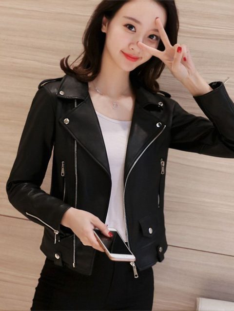Women Fashion PU Motorcycle Jacket Zipper Pocket Leather Short Jacket