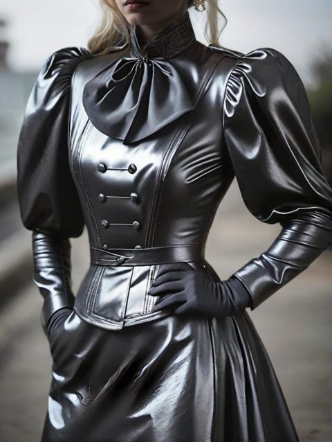 Faux Leather PU Top for Women Stand Collar Lantern Sleeve Sweet High Street American Retro Blouse Vintage Cinched Bow T shirts