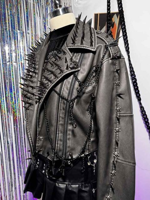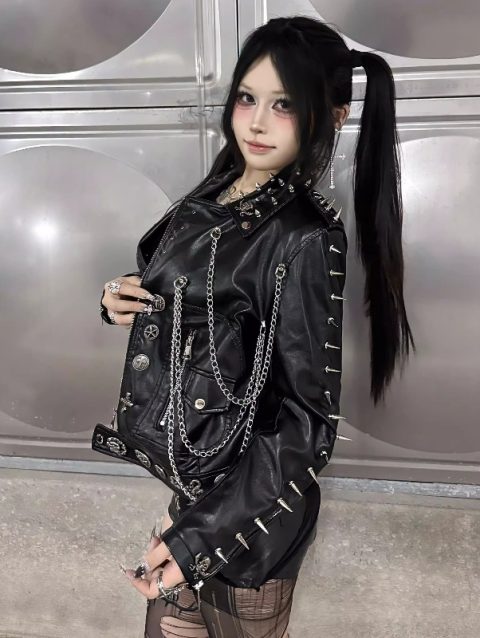 Emo E-Girls Gothic Grunge Harajuku Y2K PU Leather Jacket Spike Studded Rivet Punk Rock Goth Chain Trendy Vintage Coat