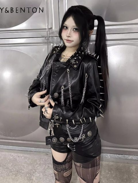 European American Punk PU Hot Girl Y2K Women’s Leather Jacket Original Design Rivet Chain Sweet Cool Heavy Industry Coat Ladies