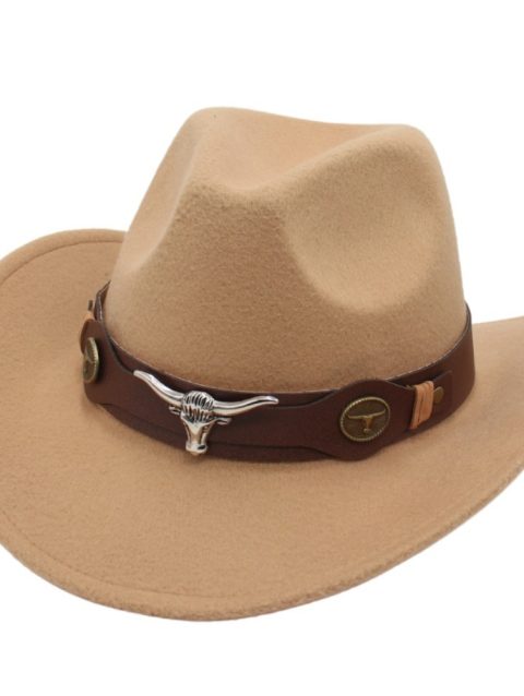 Felt Western Cowboy Hat Ox Head Accessories with Cow Band Tibetan Style Top Hat Ethnic Style Soft Roll Brim Cowgirl Cap Children
