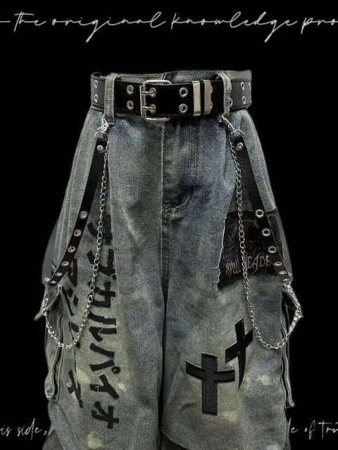 Gothic Punk Women Dark Seven Part Jeans For Men And Women Summer Wasteland Style Wrinkled Patchwork Wide Leg Pants