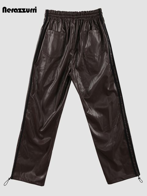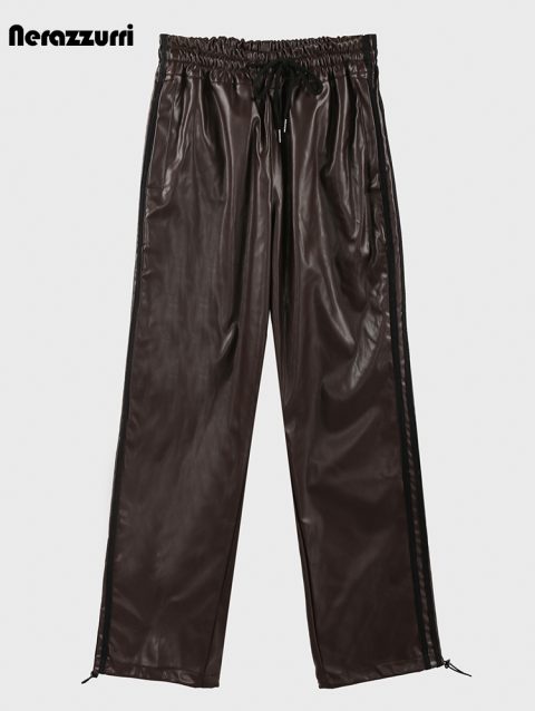Nerazzurri Autumn High Street Style Soft Black Pu Leather Sports Straight Pants Women Elastic Waist Loose Casual Trousers 2023