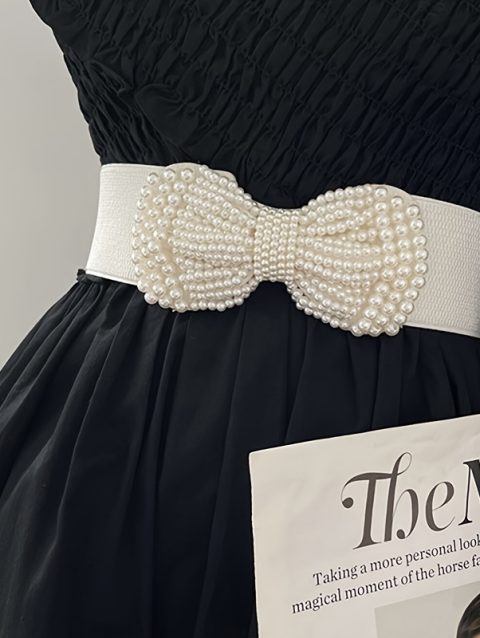 2024 Women’s Elastic Wide Belt Pearl Waist Cover Versatile Dress Decoration High Quality Wide Pearl Bow Brown Belt