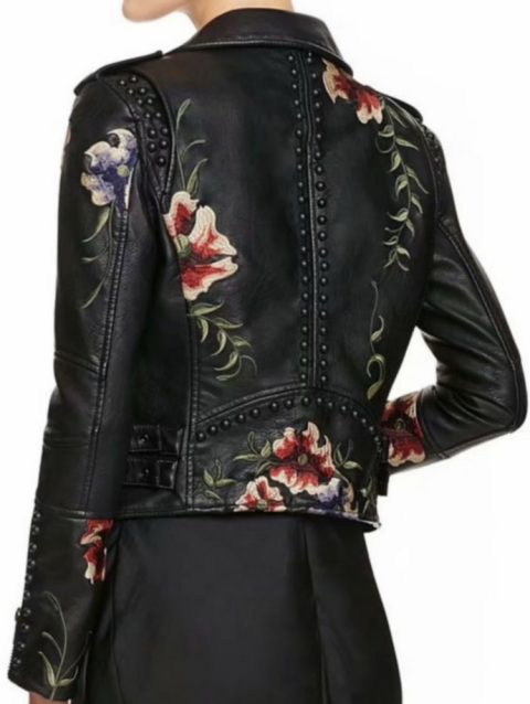 2025 Autumn Winter Floral Print Embroidery Faux Leather Jackets Women High Street Moto Rivet Black Punk Outerwear Biker Coats