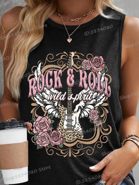 Rock Roll Wild T-shirts Vintage Style Rose Guitar Shirt New Summer Fashion O-Neck Tshirt Music Lover women Sleeveless Tanks Tops