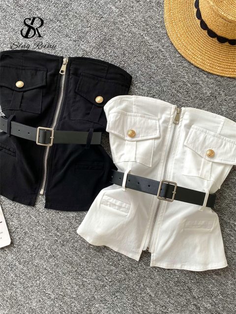 SINGREINY Safari Style Sexy Top 2025 Ladies Sleeveless Pockets Sashes Short Camisole Streetwear Strapless Zipper Retro Tank Top