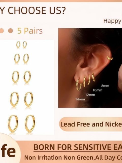 5 Pairs 14K Gold Plated Huggie Hoop Earrings for Women Lightweight Minimalist Small Hoops Multiple Piercing Stack Set Earrings