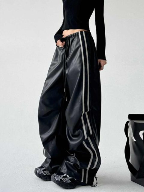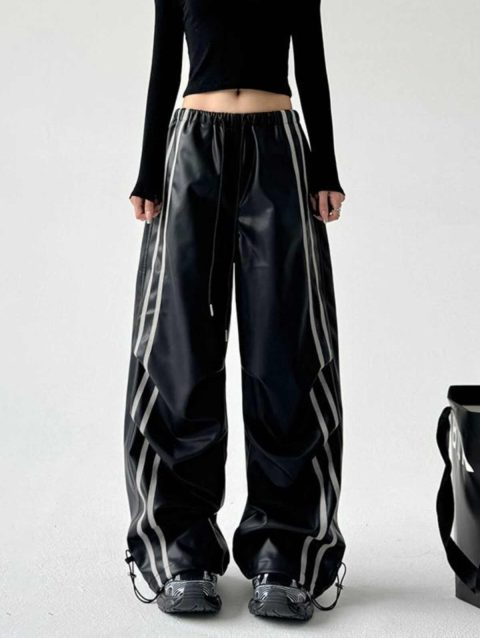 Women’s Black Gothic PU Leather Pants Baggy Oversize Long Pants Harajuku Japanese 2000s Style Y2k Emo Vintage Trousers Clothes