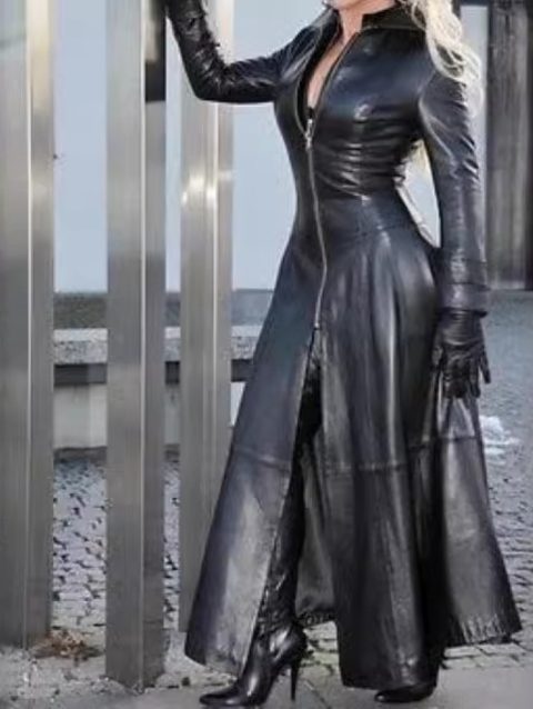 Autumn and Winter European and American Solid Color Lapel Long Temperament Commuter Zipper Jacket PU Leather Jacket