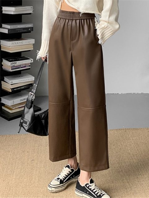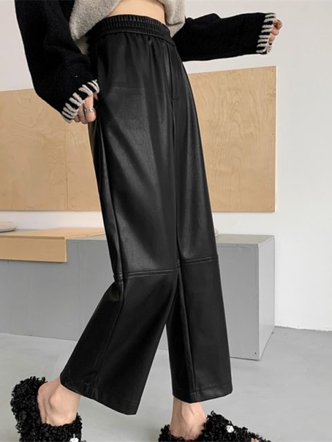 Autumn Winter PU Leather Women’s Ankle Length Pants 2024 New Korean High Waist Black Straight Loose Pants Pocket Female