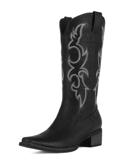 Black Cowboy Boots for Women – Embroidered Cowgirl Boots Western Mid Calf Fashion Chunky Heel Pointed Toe Country Boots