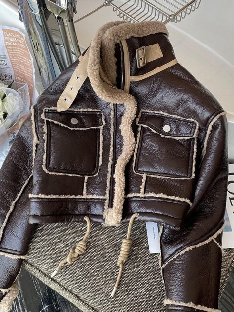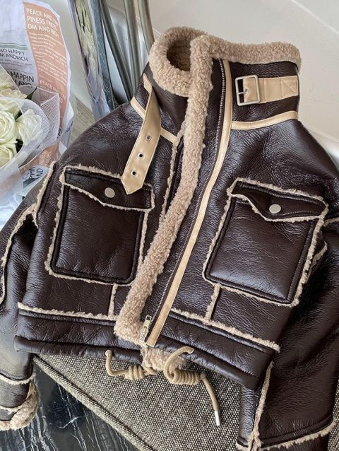 Black Lambswool Jacket Winter Thickened Plus Velvet Motorcycle Faux Leather Stitching Coat PU Plush Cardigan Stand Collar Tops