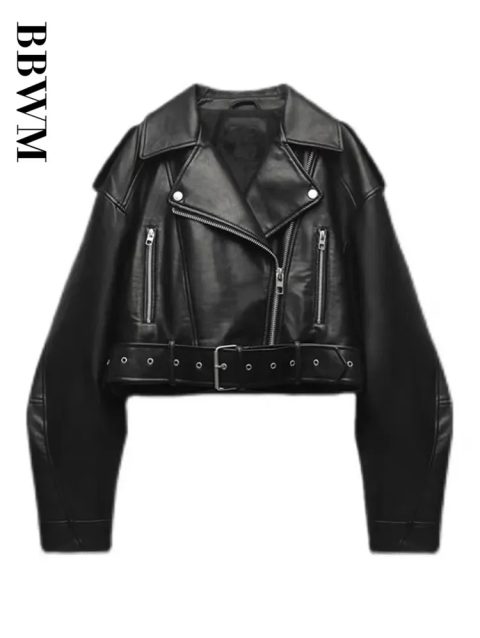 BBWM Women Oversized Vintage Loose Pu Faux Leather Short Jacket with Belt Streetwear Female Zipper Retro Moto Biker Coat Outwear