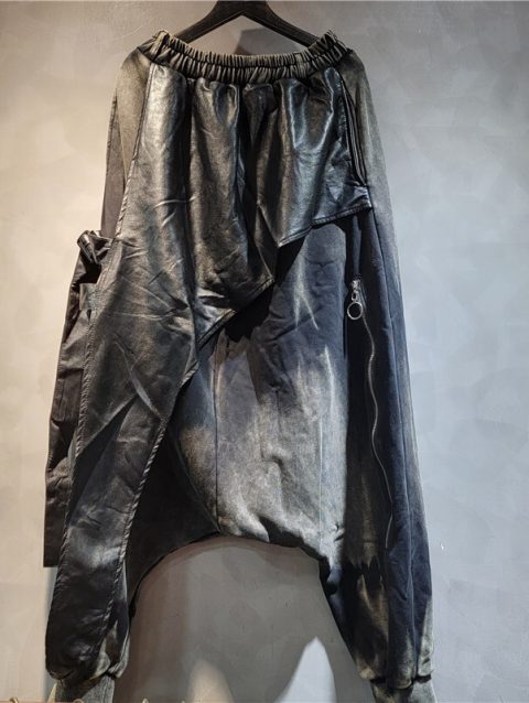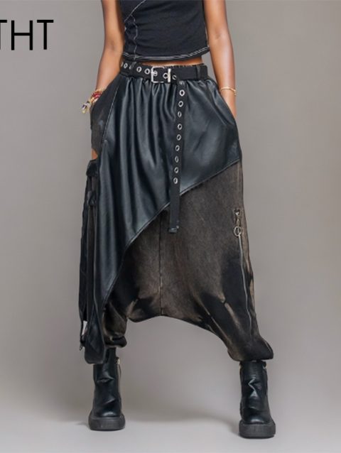 WTHT Vintage Women Irregular Spliced Leather Zipper Design Jeans Fashion Elastic Waist Harem Pants Female 2025 Summer 1LS1592