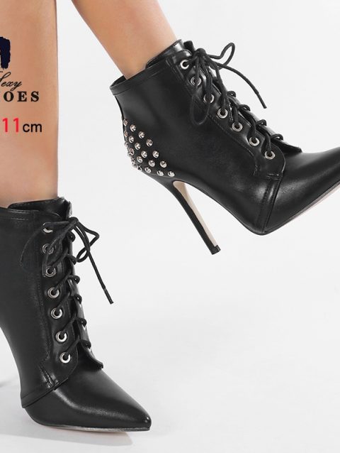 Punk Style Lace-up Boots For Woman 2025 Spring Autumn Pointed Toe Short Boots 11CM Stiletto Heels Botas Women Black Rivet Shoes