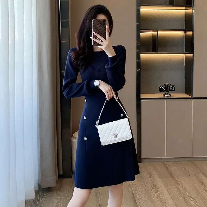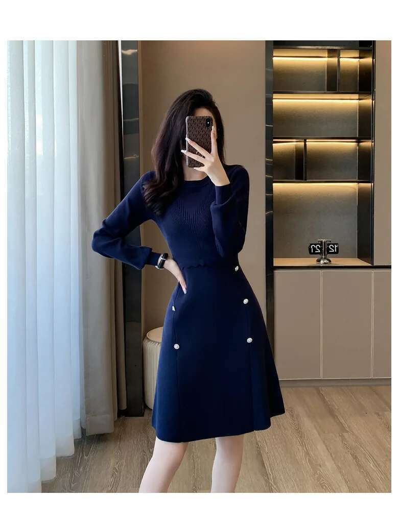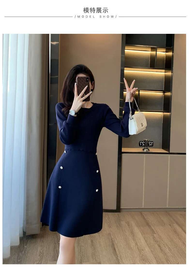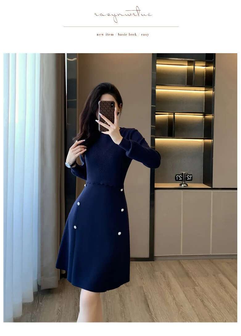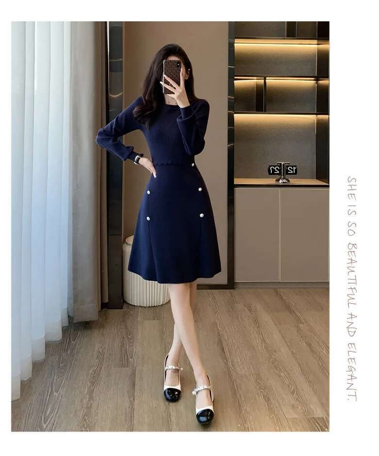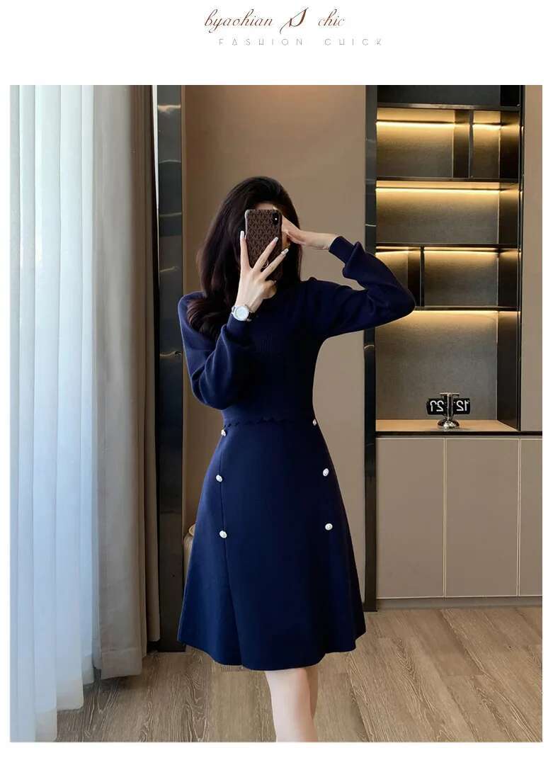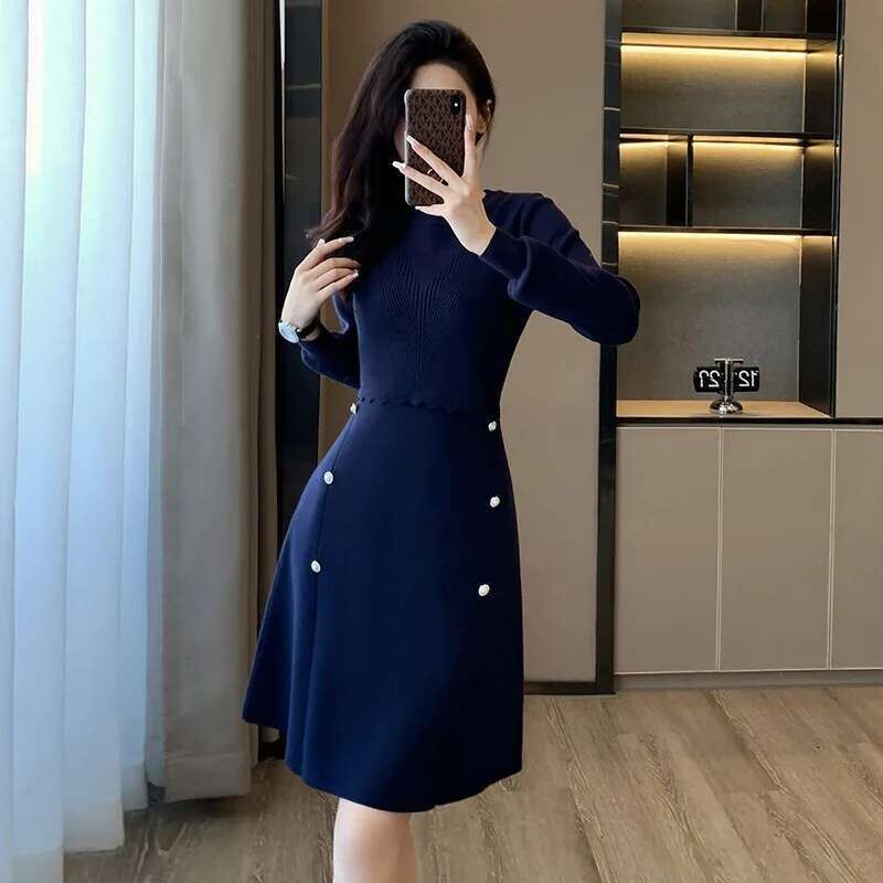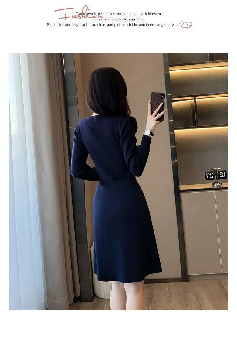 Add to cart0903 Blue A-line Sweater Dress Women False Two Piece A-line High Waisted Knitted Dress Female Slim Stretch Short Dress Ladies
