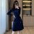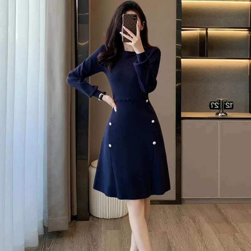 0903 Blue A-line Sweater Dress Women False Two Piece A-line High Waisted Knitted Dress Female Slim Stretch Short Dress Ladies