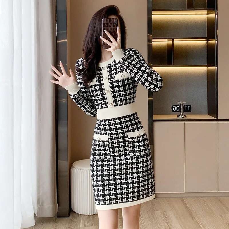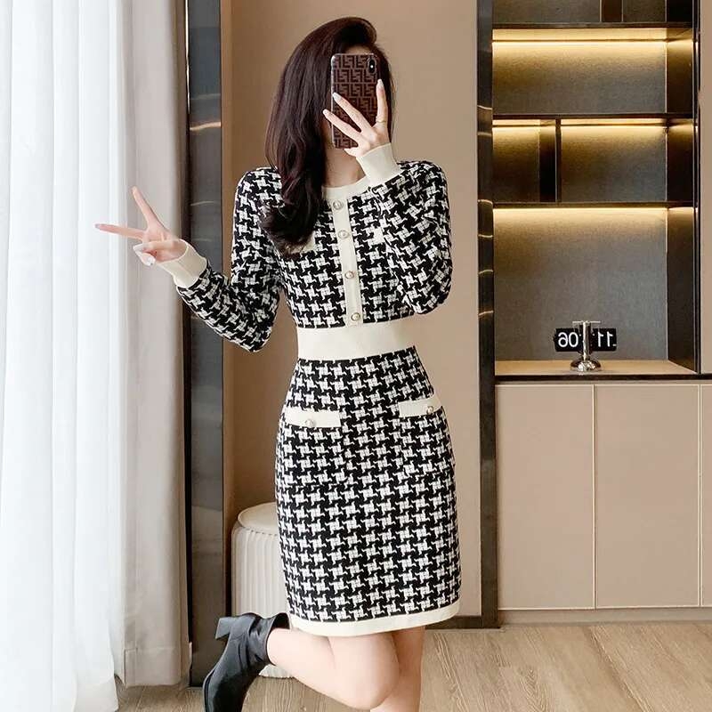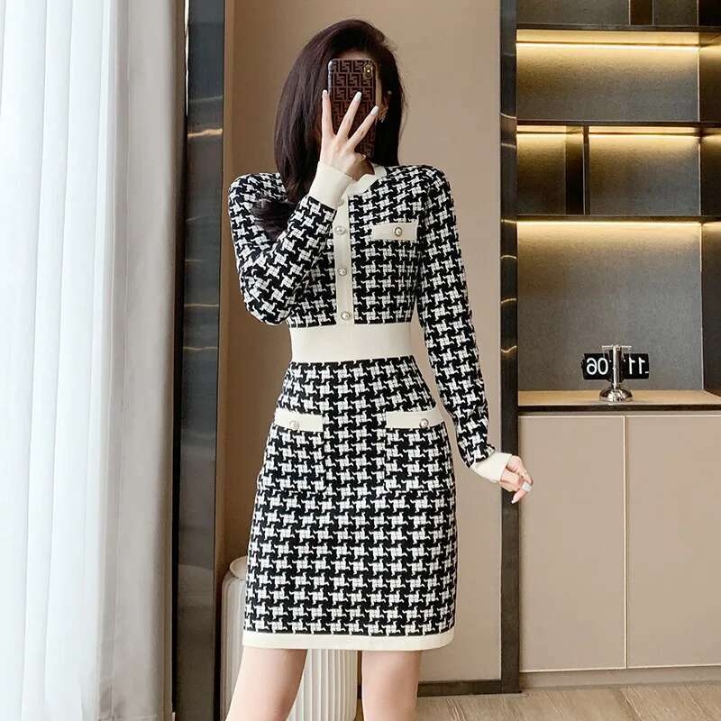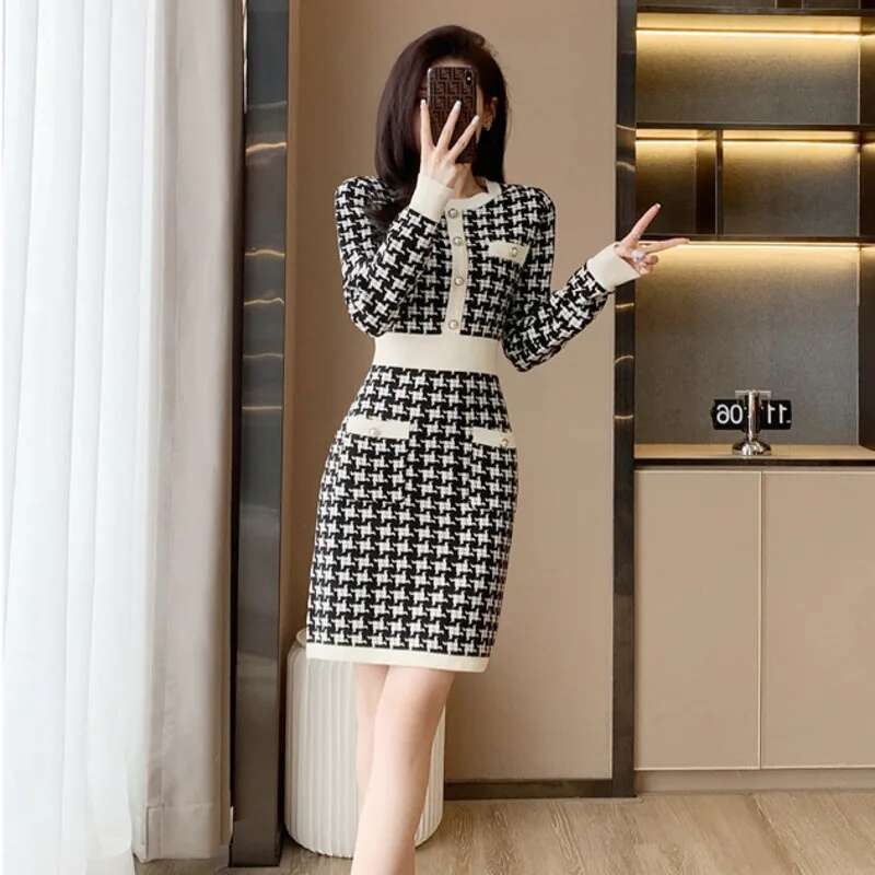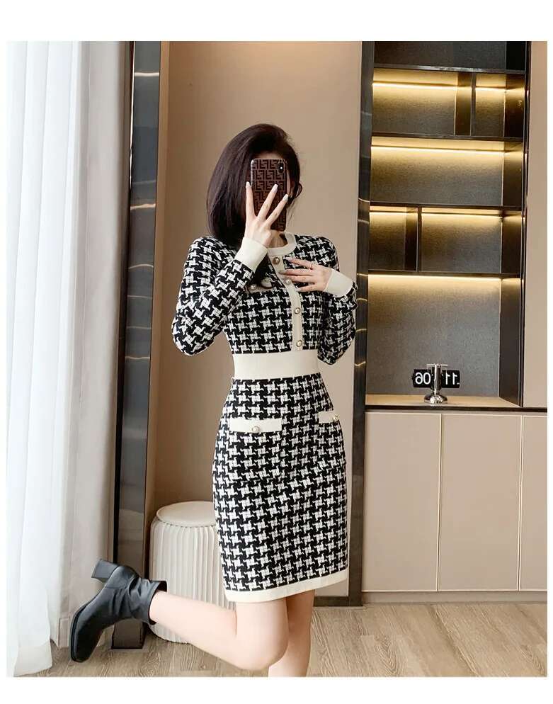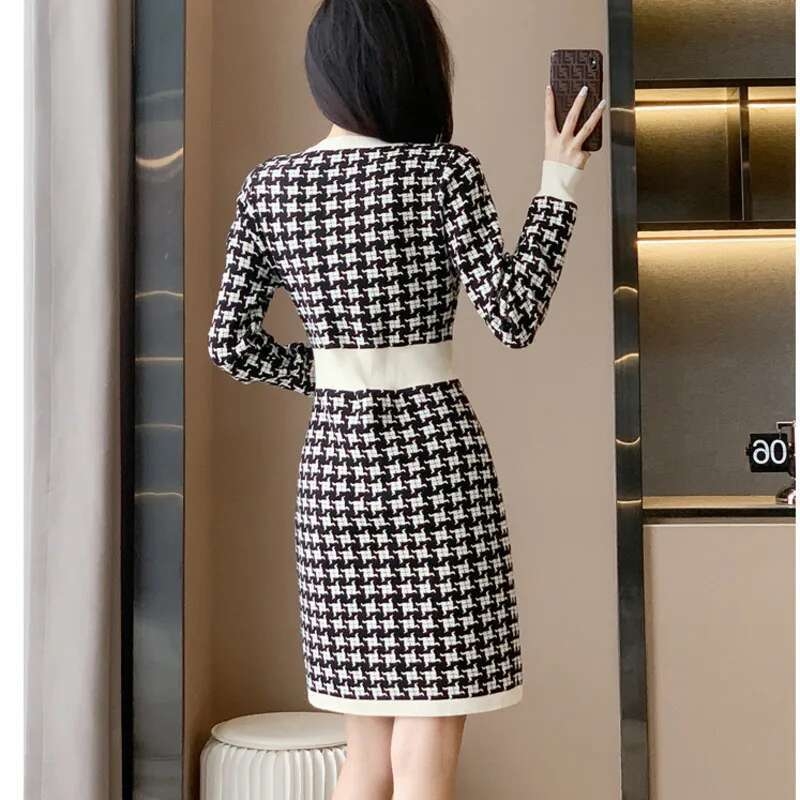 0906 Vintage Plaid Mini Dress Women Round Neck Short Sweater Dress Buttons Pockets Sexy Office Knitted Mini Dress Femme Elegant