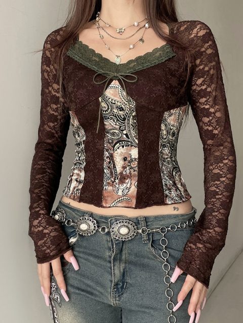 Women’s Retro Contrasting Printed Lace Patchwork T-shirt Female Long Sleeved Square Neck Slim Sexy Tops