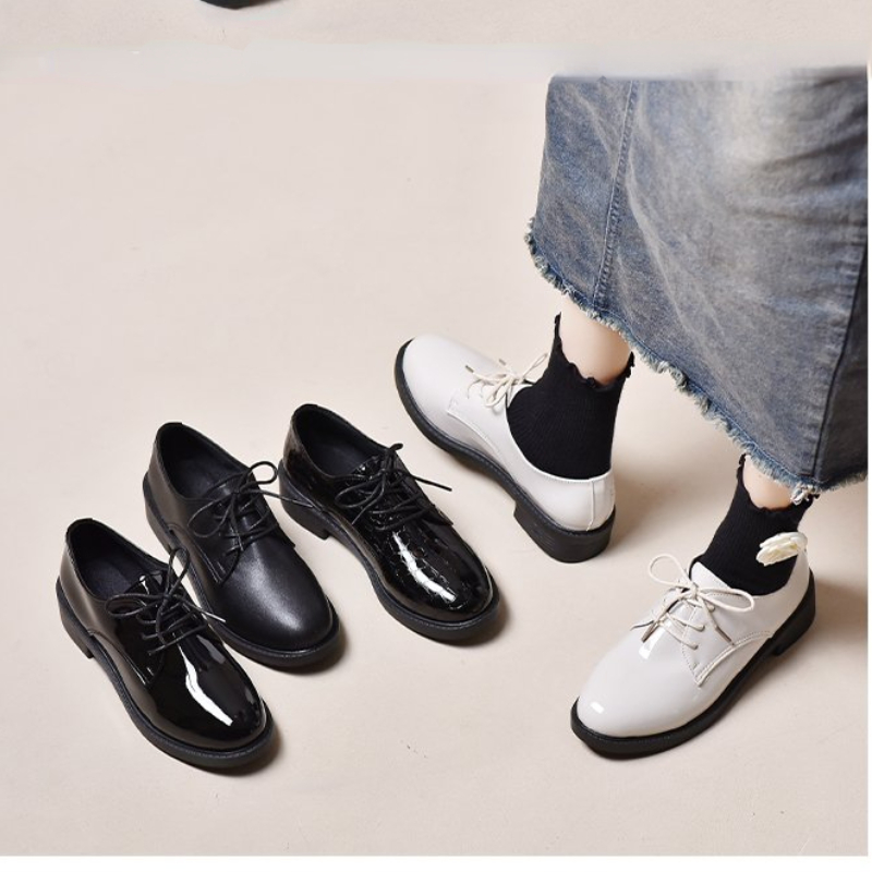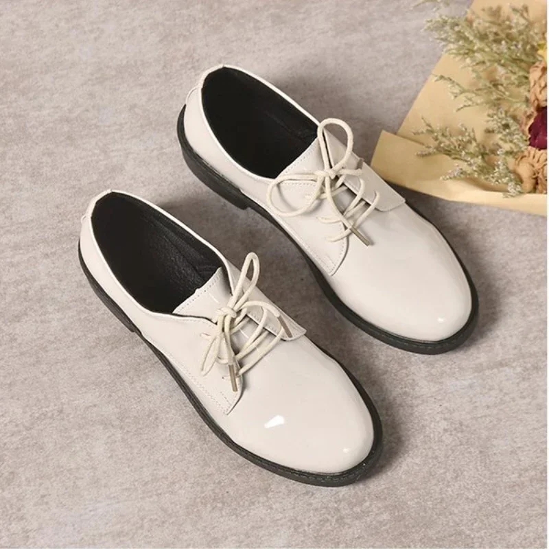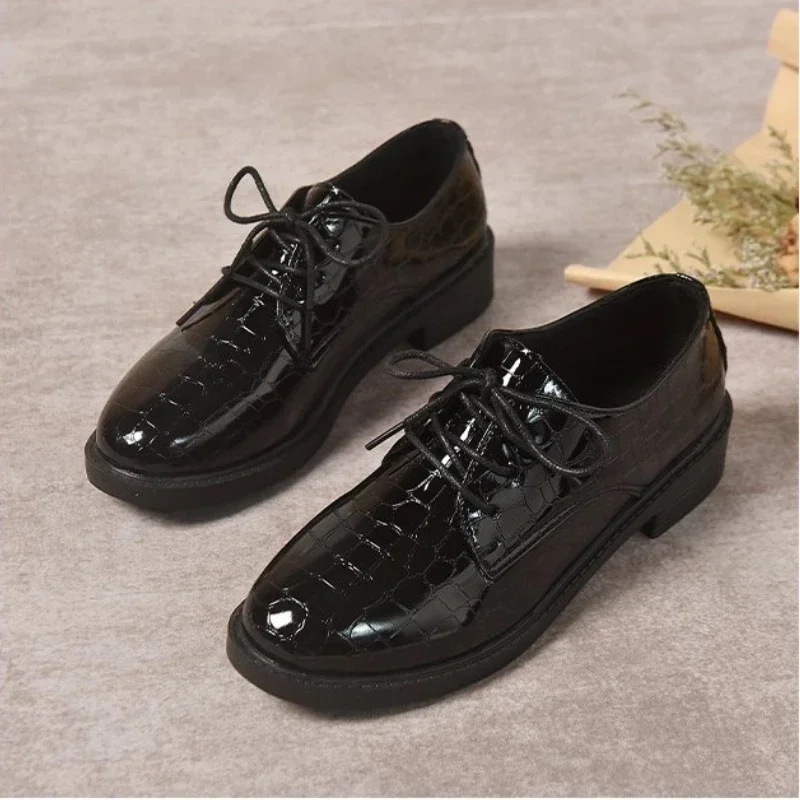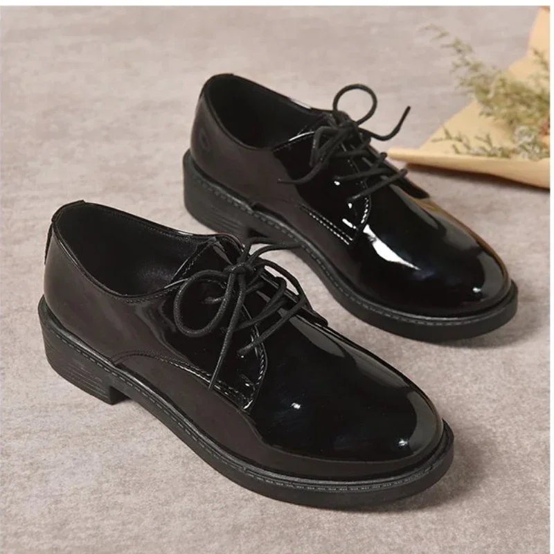 2024 New Fashion Black Leather Shoes Women’s Lace up Low Heel Shoes Plus Size Flat Shoes
