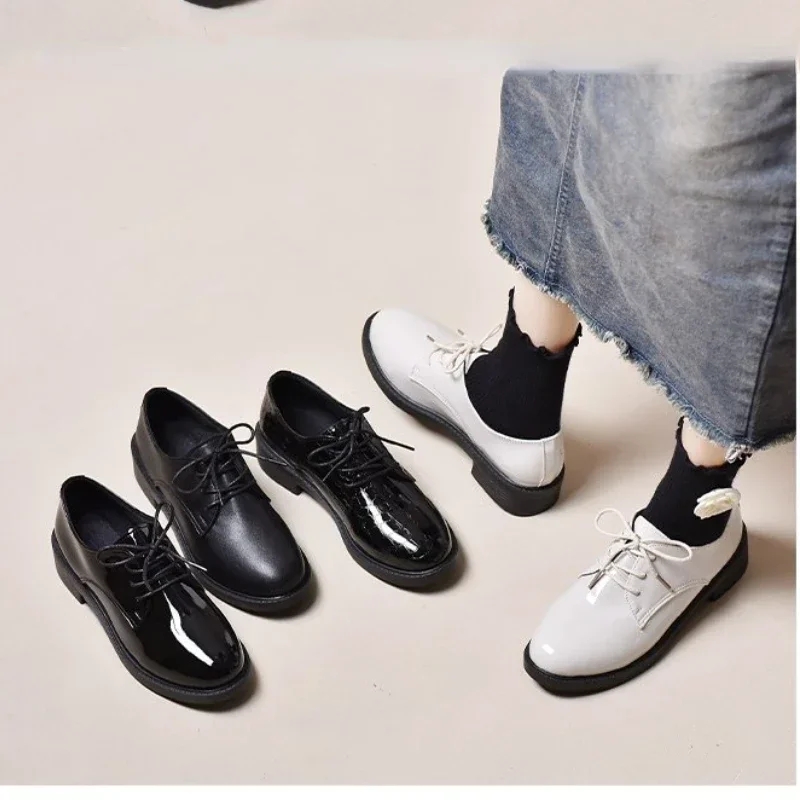 2024 New Fashion Black Leather Shoes Women's Lace up Low Heel Shoes Plus Size Flat Shoes