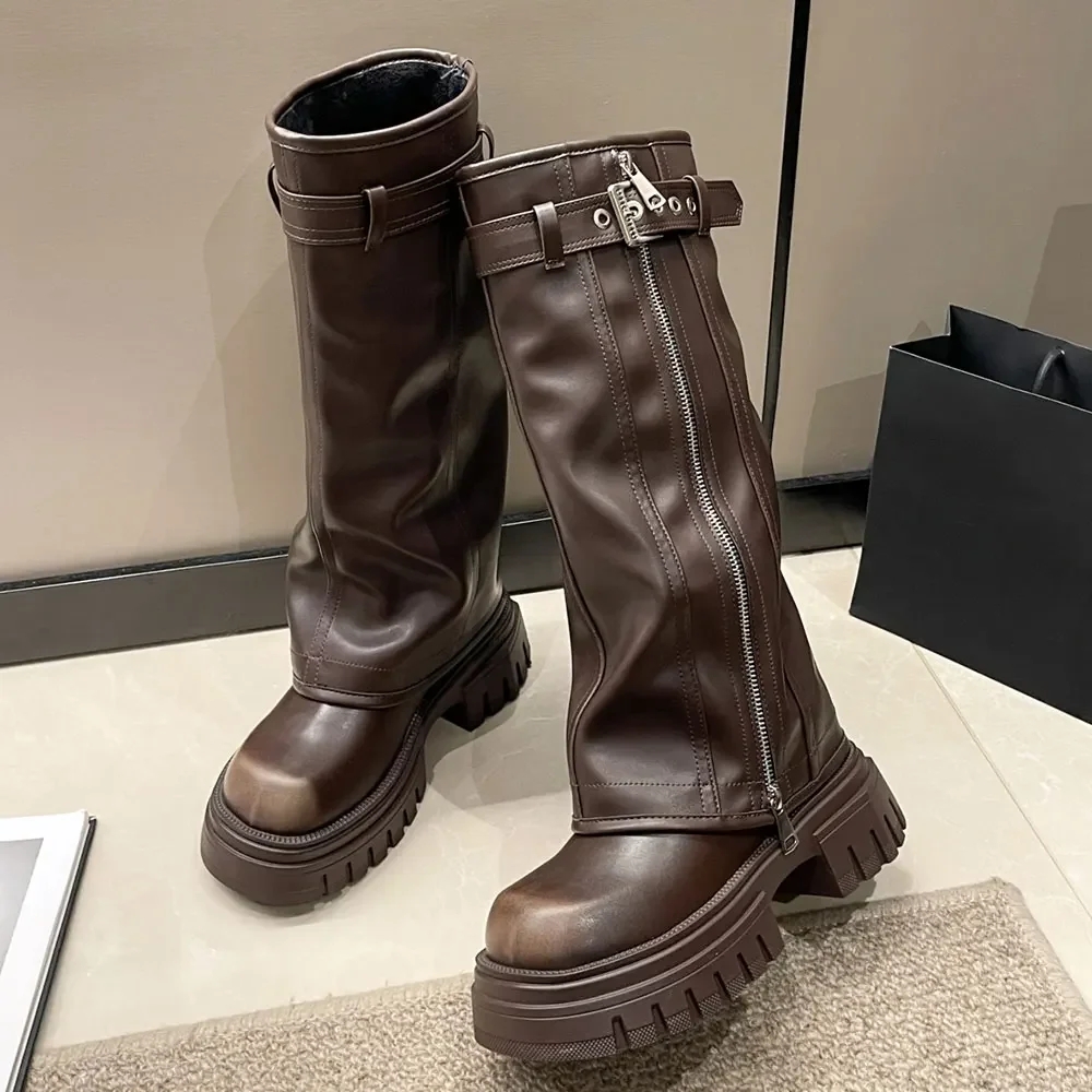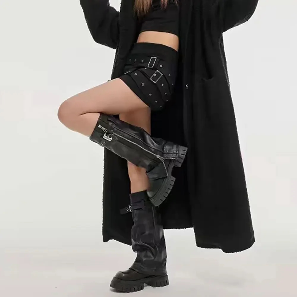 2024 Platform Black Knee High Women Boots Wasteland Y2k Style Vintage Biker Boot Women Brown Belt Buckle Booties Size 35-40