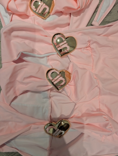 gorgeous pink bathing suit! really pretty pink colour in person. the hardware is very high quality — heavy and well made. The cut on this bathing suit is very unique and I love the cover up skirt.