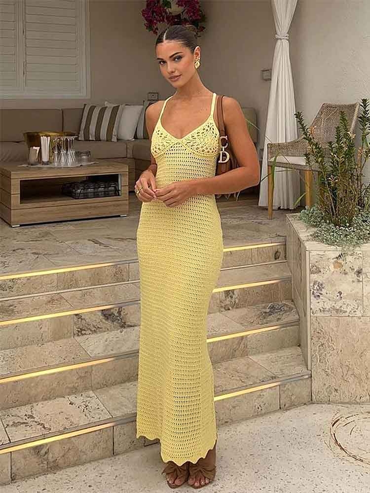 2024 Solid Colour Sexy Knit Cut Out Holiday Swimsuit Cover Up Women’s Summer V-Neck Spaghetti Strap Bodycon Beach Maxi Dress K32