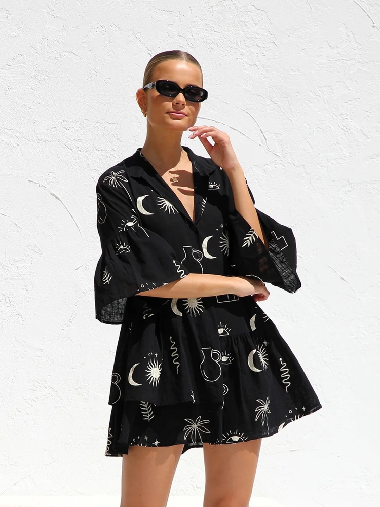2024 Summer Fashion New Print Elegant Women’s Mid Length Sexy Dress Ethnic Style V-neck Pleated Flare Sleeve Dress