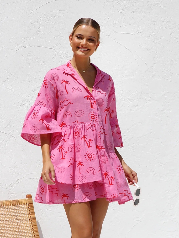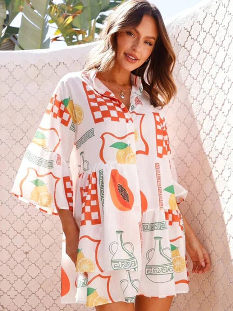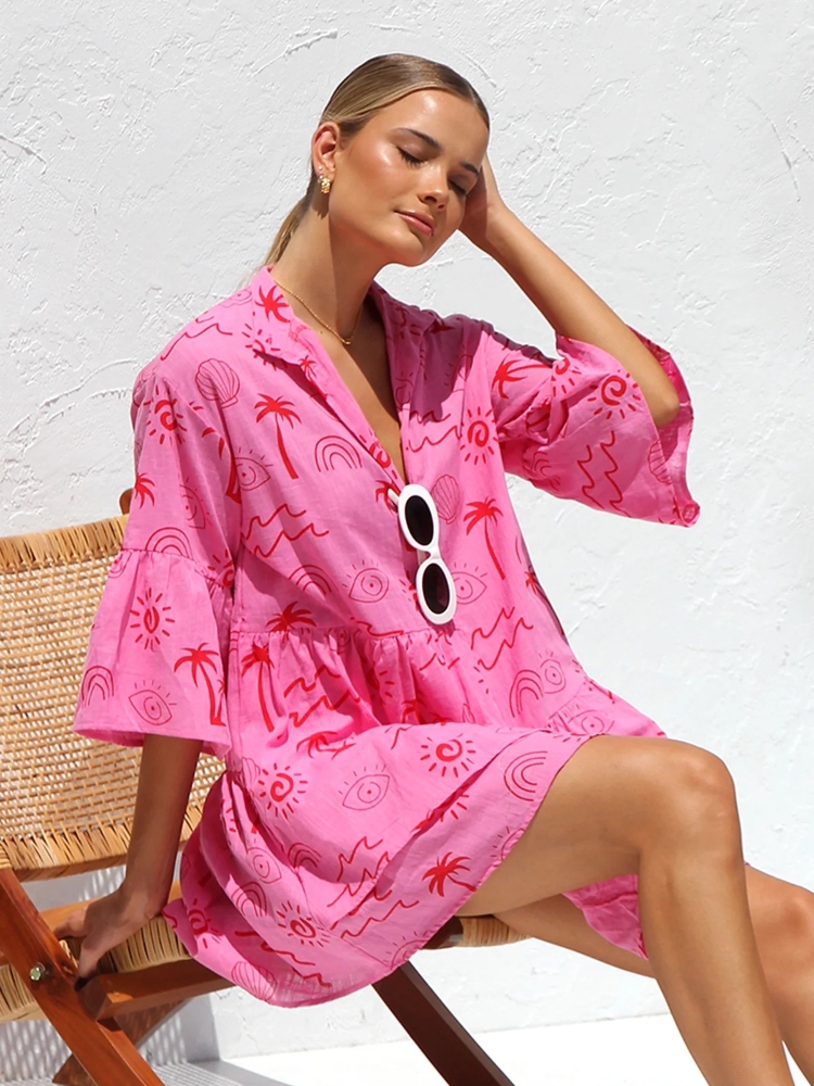 2 reviews for 2024 Summer Fashion New Print Elegant Women’s Mid Length Sexy Dress Ethnic Style V-neck Pleated Flare Sleeve Dress