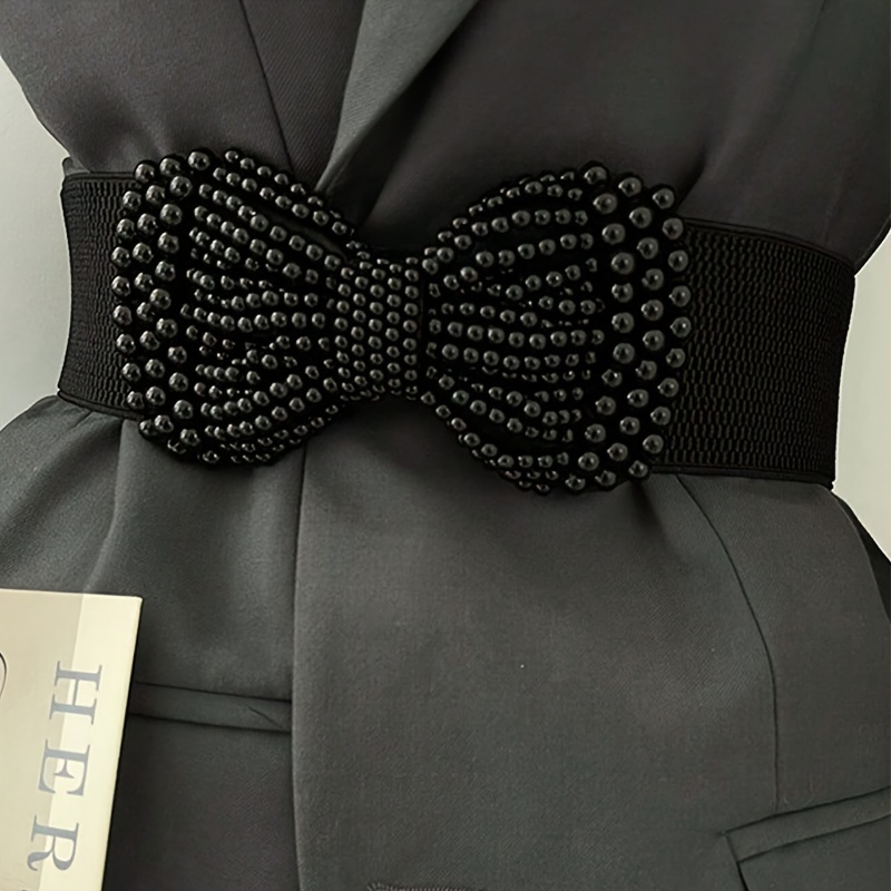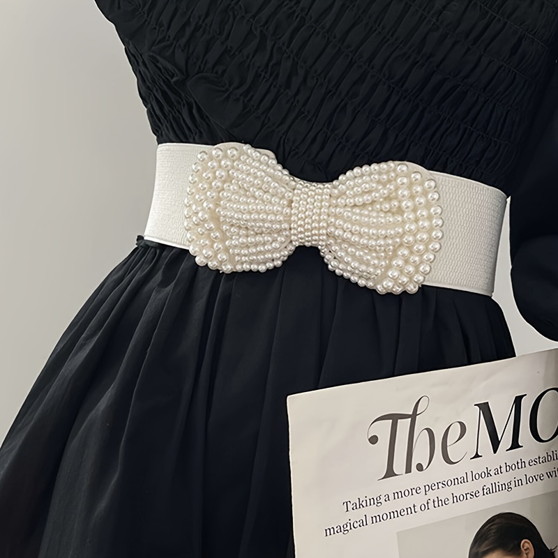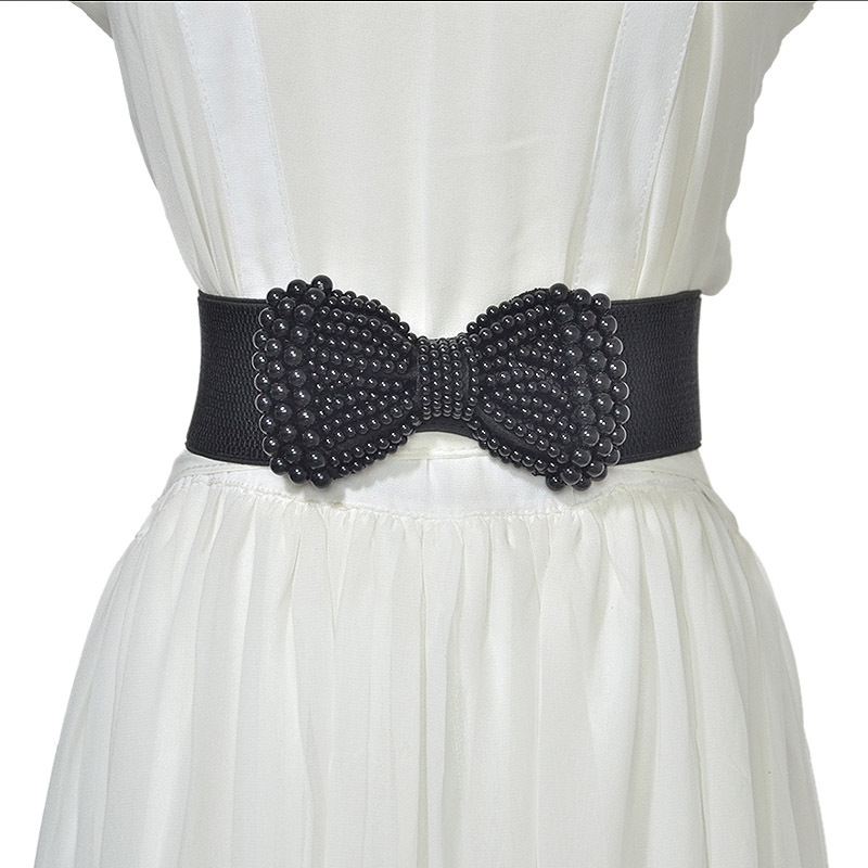 2024 Women’s Elastic Wide Belt Pearl Waist Cover Versatile Dress Decoration High Quality Wide Pearl Bow Brown Belt