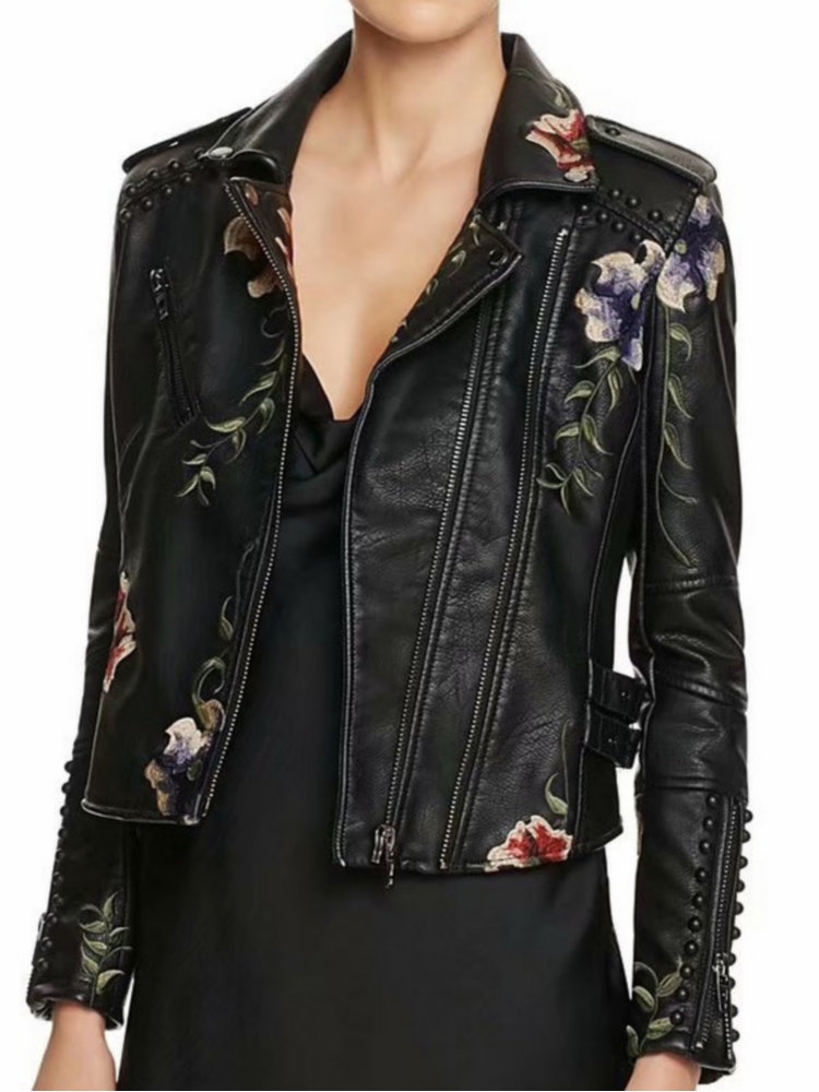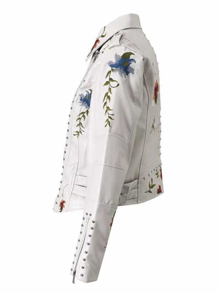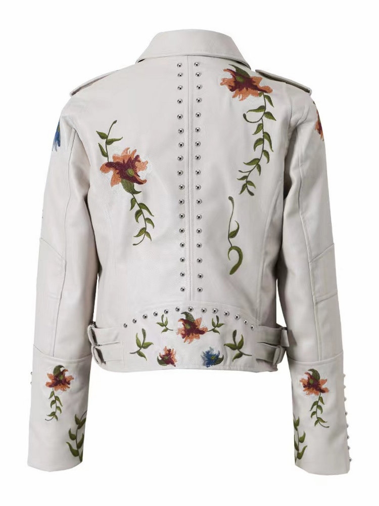 2025 Autumn Winter Floral Print Embroidery Faux Leather Jackets Women High Street Moto Rivet Black Punk Outerwear Biker Coats