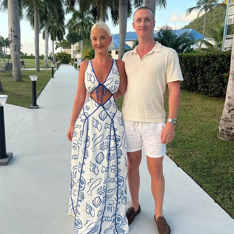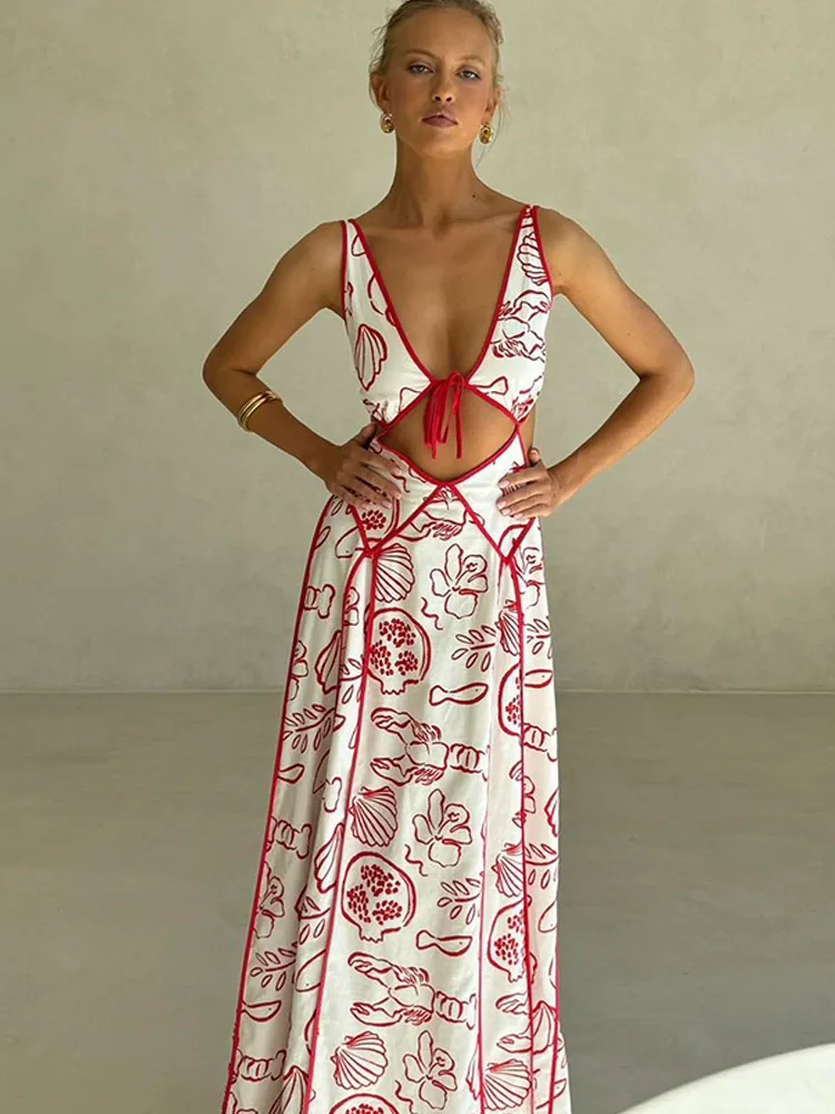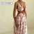 2025 New Sexy Vintage Print V Neck Cutout Suspender Tie Up Slim Backless Lace Up Women Maxi Dresses Beach Holiday Party Dress