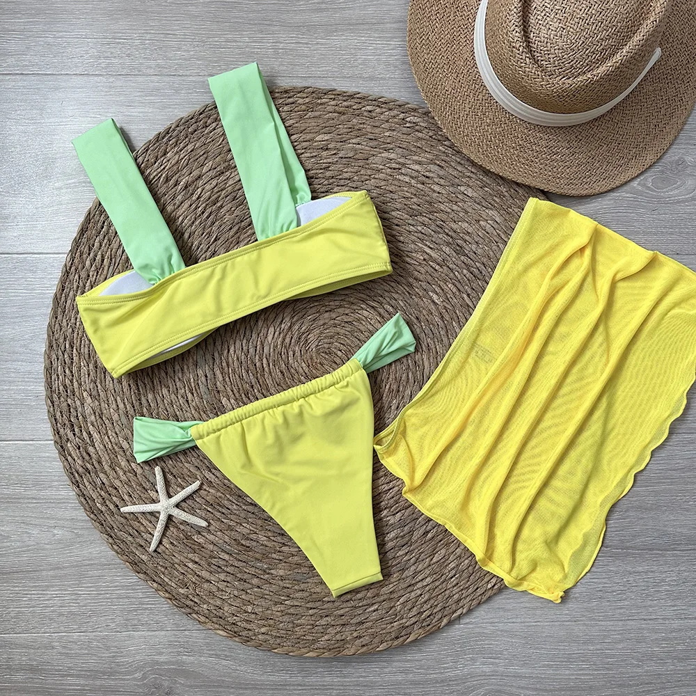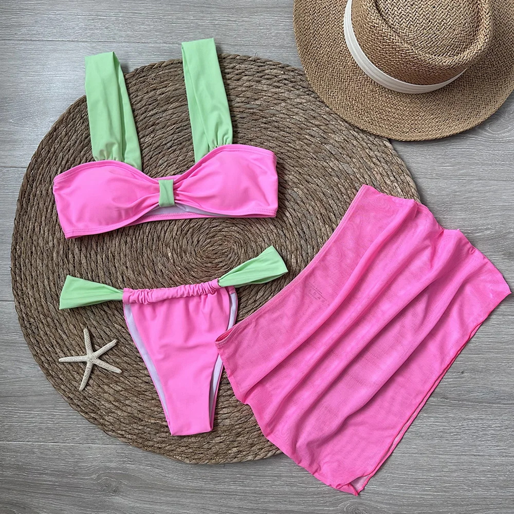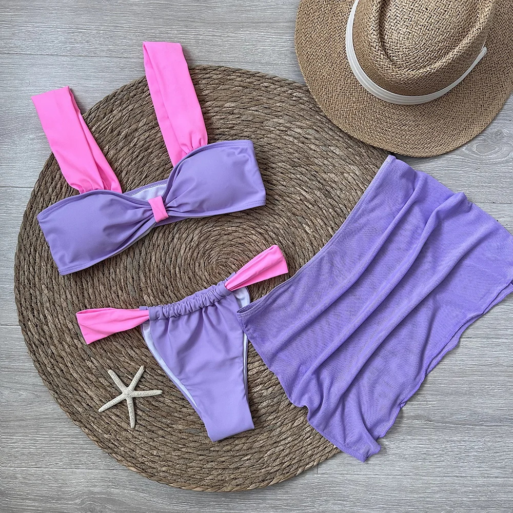 3 Pieces Bikini Set Wiht Mini Skirt Women Swimwear 2024 Sexy Bikinis Push Up Beachwear Solid Bodysuit Micro Thong Biquini Female