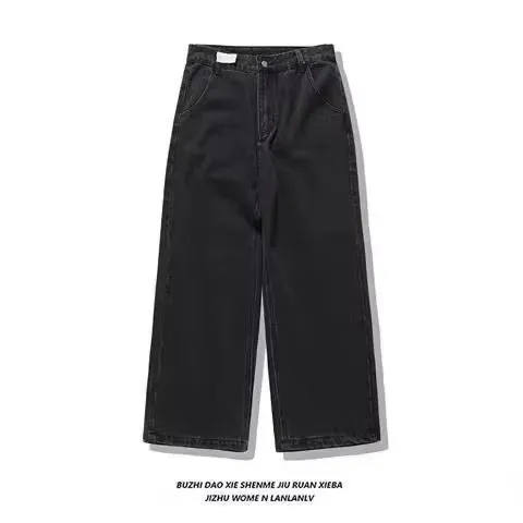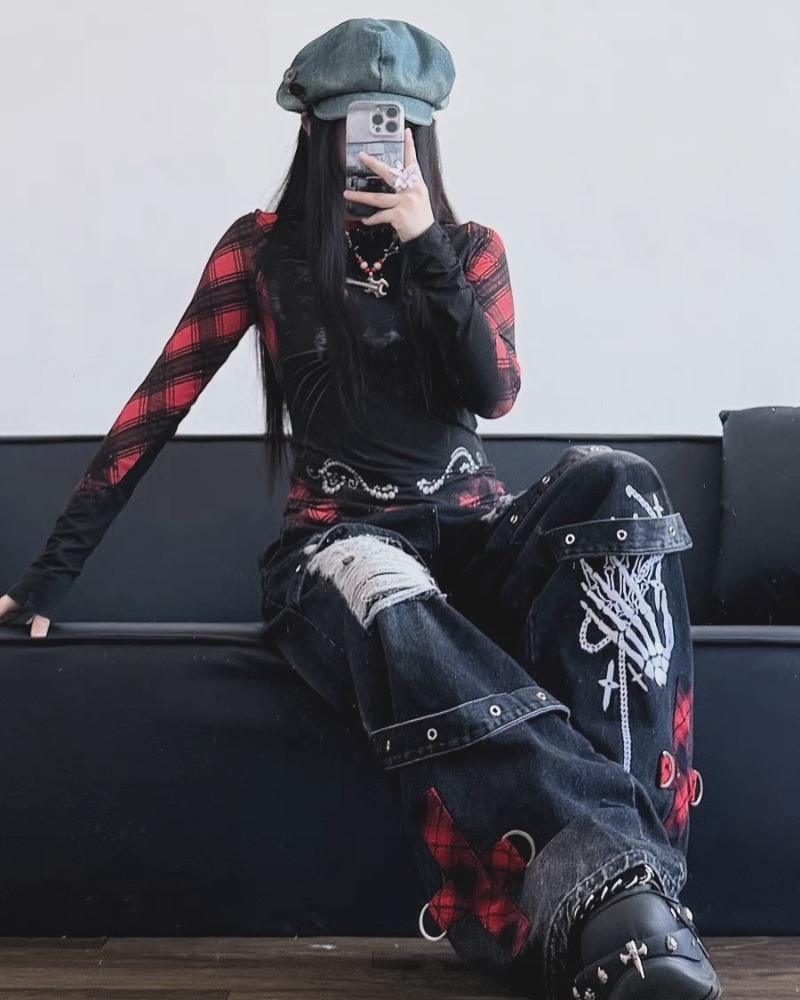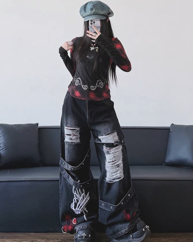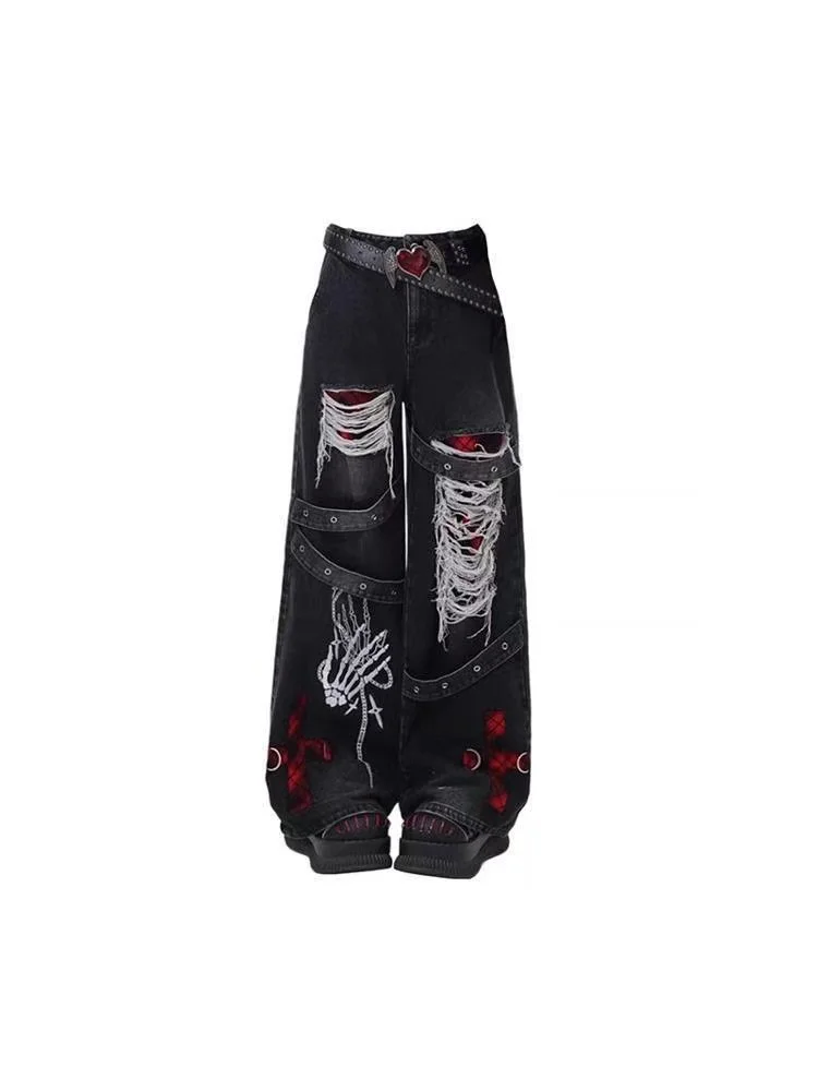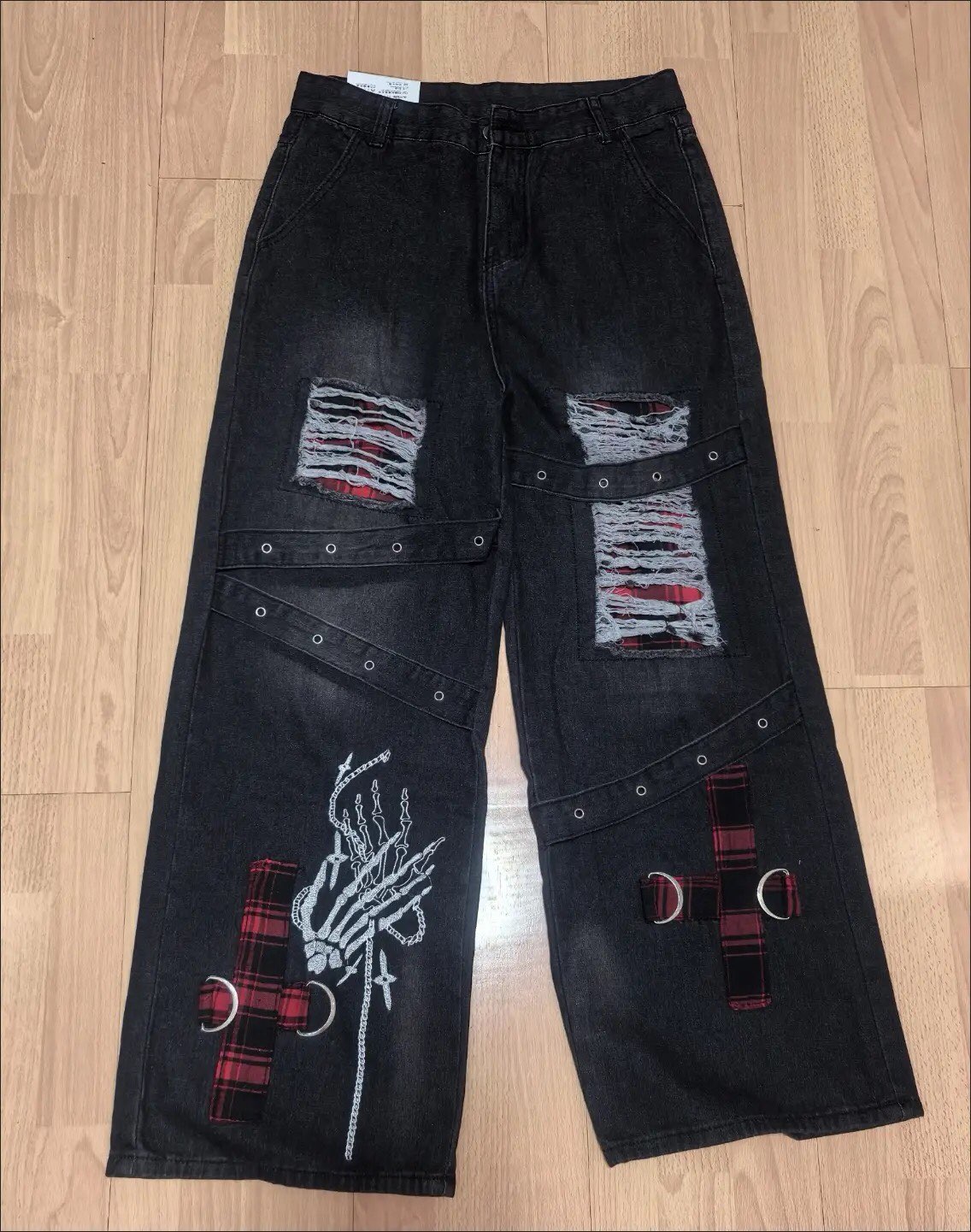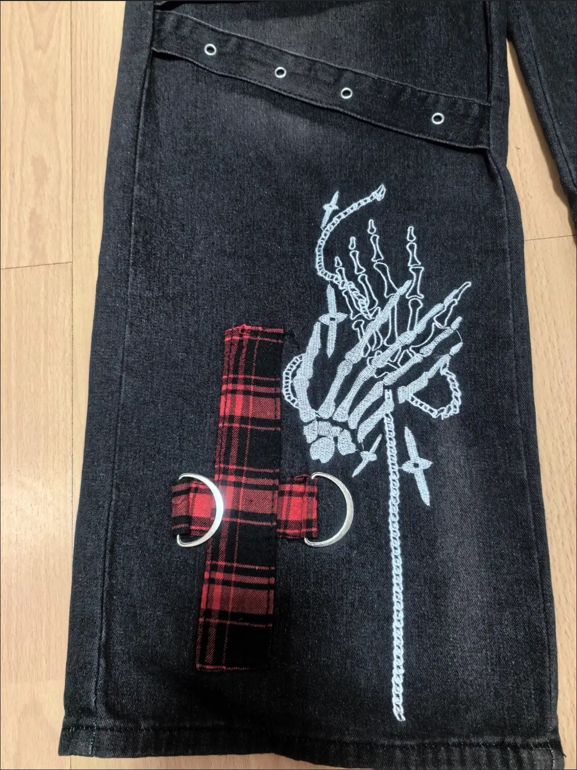 90s Skeleton Handprint Wide Leg Jeans High Street Niche Design Dark Tone Flared Hem Long Pants Streetwear Chic Drop Crotch